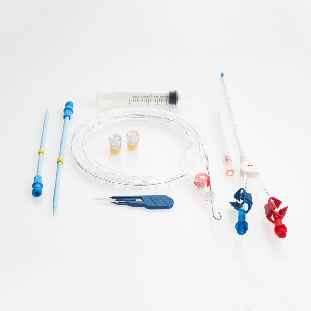 Polyurethane catheter double lumen, J ended length marked guide wire, introducer needle (safety needle protector), syringe, vessel dilator, scalpel (safety scalpel), injection cap, arterial red clamp, venous blue clamp.