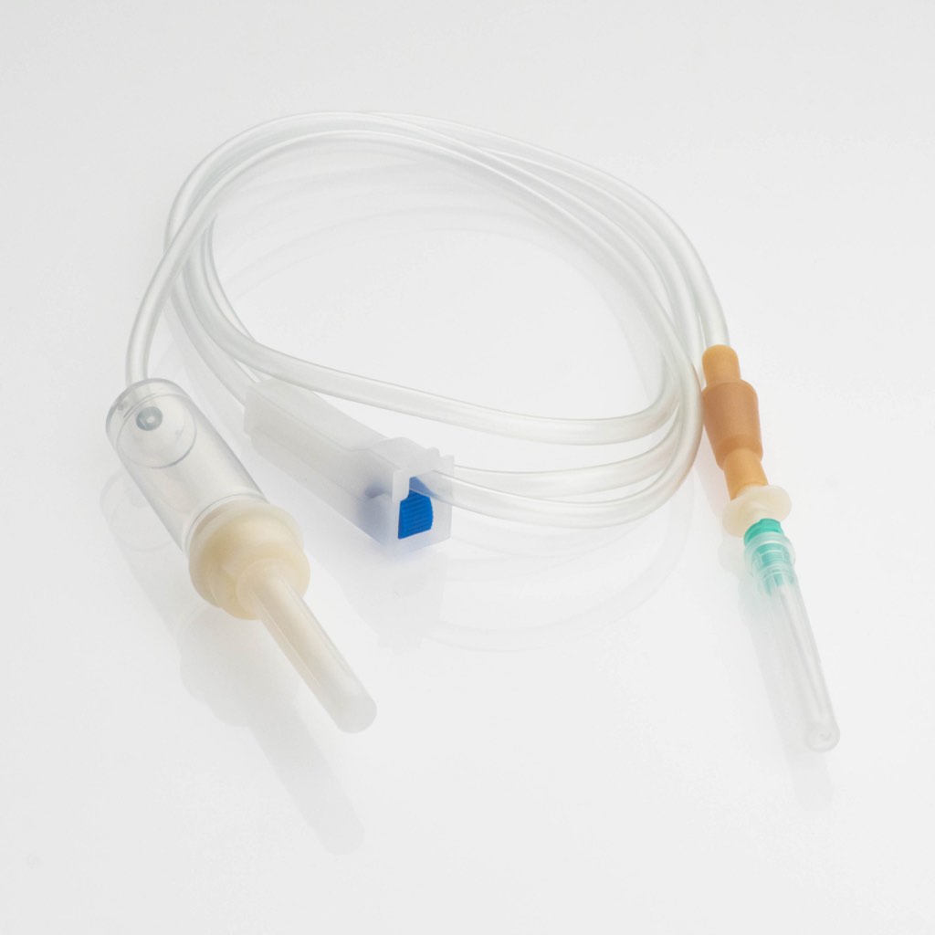 A sterile, single use, single chamber IV set for pressure and gravity infusion for fluids.